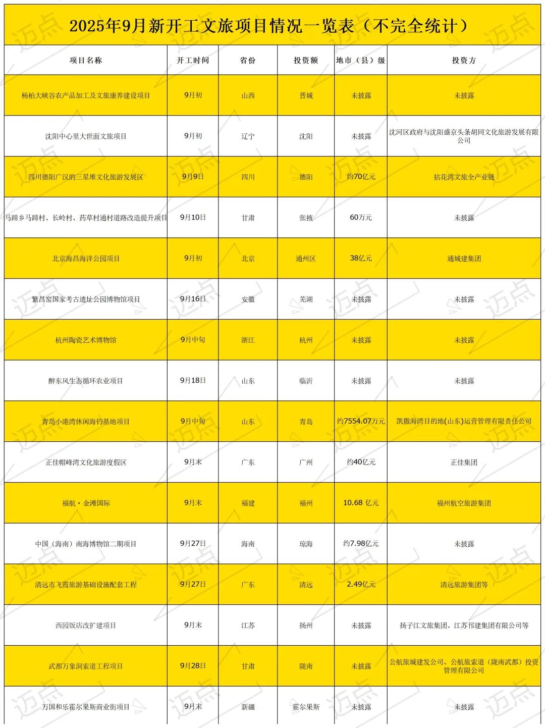 据迈点不完全统计,2025年9月新开工文旅项目16个,其中单项目最高投资金额达到70亿元。