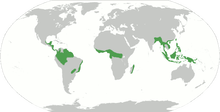 大多数的热带雨林主要分布在四个生物地理界:热带界(非洲大陆,马达加斯加和一些散岛)、澳洲界(澳大利亚,新几内亚和太平洋群岛)、印度马来亚界(印度,斯里兰卡,亚洲大陆,东南亚)、新热带界(南美,中美和加勒比群岛) 。