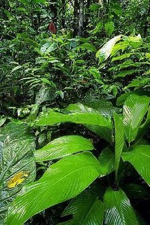A.F.W.席姆佩尔曾扼要指出热带雨林的特征是具有常绿喜湿、高逾30米的乔木,富有厚茎的藤本、木质和草本的附生植物。热带雨林拥有全球最丰富的植物种,其中70%为木本植物(高位芽植物)。热带雨林通常每英亩(合4047平方米)生长 40~100种乔木,形成优势种分化不明显(种多样性极大)的混合雨林。但也有单优种群落出现,即上层乔木由少数树种组成,如南美洲北部泛滥平原上的毛拉豆雨林,在东南亚常成小片分布的龙脑香雨林等。乔木高大,个别类型可达40~60米,主干挺直如圆柱状,胸径一般为50~60厘米,大者为100~200厘米。乔木通常分化为3层结构,上层多呈不连续状,使雨林顶部起伏不平,树干基部普遍有板状根发育。乔木中下层树冠郁闭,使林内光照急剧减弱,经常出现树干和老枝着生花果的茎花现象。雨林中乔木一般具有带滴水叶尖(即尾状突出的叶尖)的中型革质叶片,缺乏同步的生物节律(如老叶更新、花期终始等)。木质藤本植物茎粗20厘米以上,穿行于最高层树木之间,如棕榈科省藤属的茎长可达 300米。大量附生的蕨类和有花植物为雨林重要特征,它随所在层位局部小环境而有从湿生到旱生的各种生态类型,半附生的绞杀植物尤具特色。林下真正灌木较少。草本植物稀疏,多耐荫湿生类型,有些属于腐生或寄生植物。